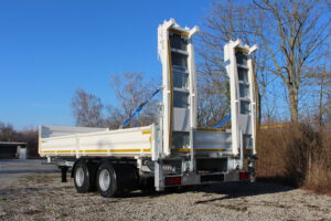 Zweiseitenkipper Typ 899/18000 mit verzinktem Chassis und Rampen, verlängert auf 6,50m mit geteilten Bordwänden und Gitterrosten in den Rampen, Eckpfosten steckbar